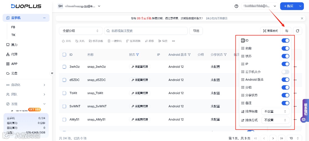 DuoPlus列表对字段功能进行了优化,用户可以拖拽选项来调整显示顺序,并设置按指定选项进行正序或倒序排序,更加灵活,显示更清晰。
