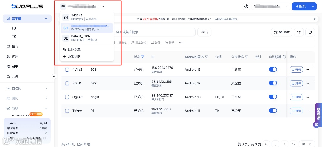 DuoPlus将团队设置与团队切换外置到操作页左上方,通过下拉菜单可选择不同团队,功能更显眼,便于用户快速访问,提高操作效率。