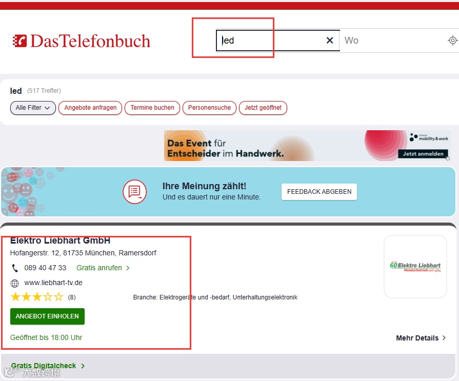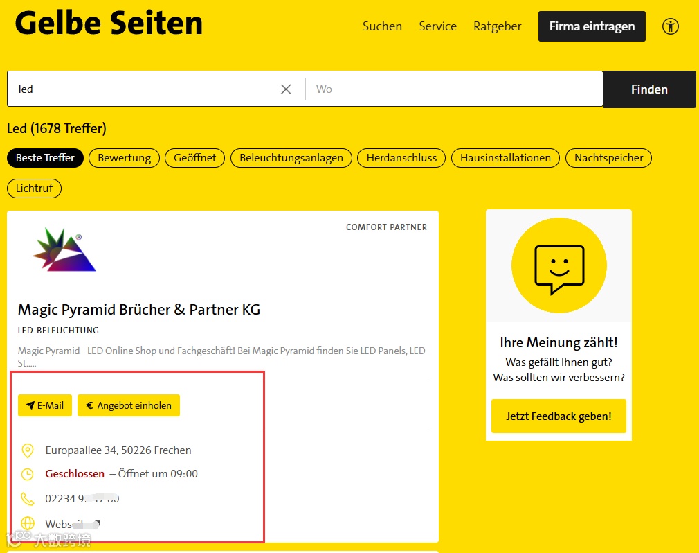 这个是德国本土在线黄页平台,基本覆盖了德国大部分的地区,大约收录了400万的德国本土企业。,可以直接用产品关键词搜索德国公司,可以看到公司名字、网站、地址、电话等等信息,也可以通过邮件进行沟通,用来搜索德国本土其实是非常不错的。