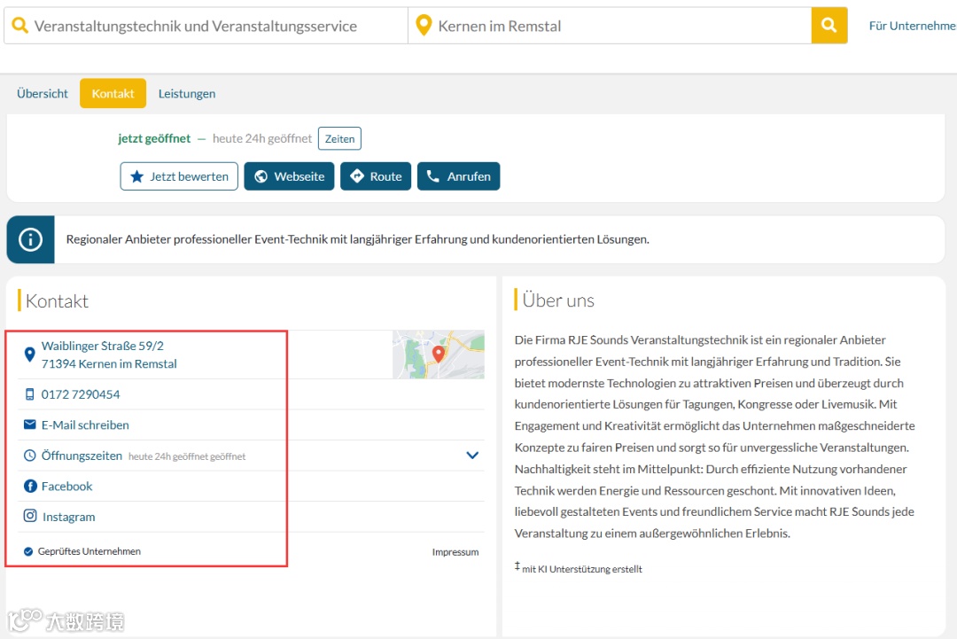 谷歌地图是全球最大的地图服务商,德国大部分都用谷歌地图,可以搜索到可以的公司名字、网站、电话、邮箱以及社媒等等联系方式,而且可以看到实景信息,是非常不错的开发客户方式。