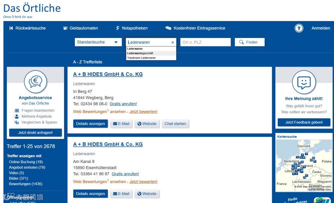是德国历史悠久且广泛使用的电话号码与地址搜索平台,该平台拥有约1亿条私人与商业联系信息,覆盖德国境内广泛的用户群体,包括个人、公司、医疗机构、餐厅等,提供个人和企业的联系方式与地址信息。
