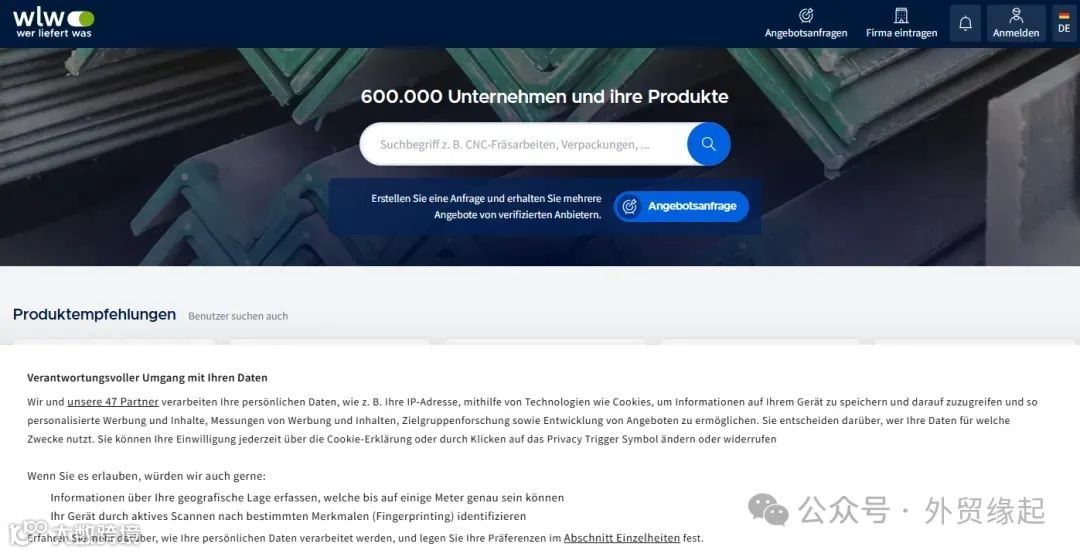查公司的话一般就输入产品关键词去查询就可以了,当然了,德国的网址一般都是用德语搜索是最好的,会更精准一些,数据也会更多一些,查询的数据也很不错,想公司名字、网站、电话啥的都会有,还可以在线沟通。
