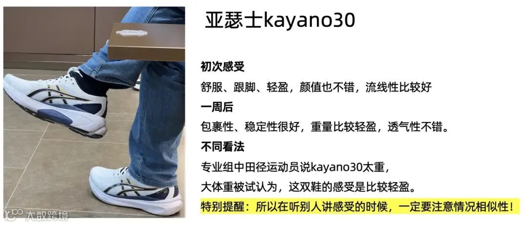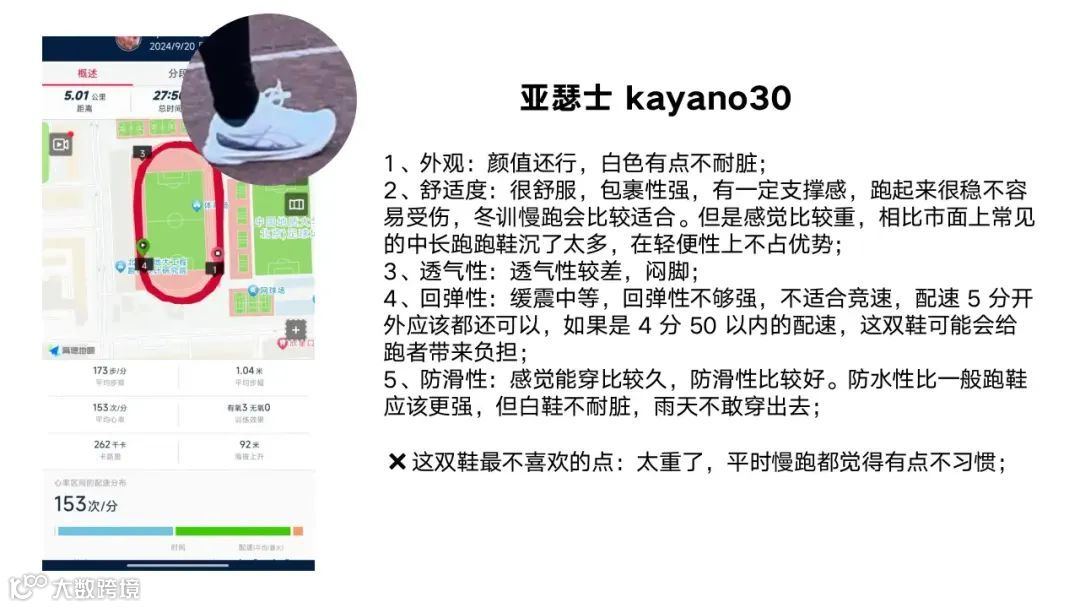 亚瑟士kayano30保护性强,脚踝稳定性优,但重量较大,适合不追求极致轻量的新手