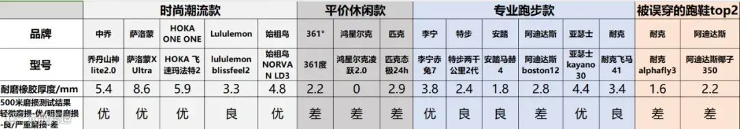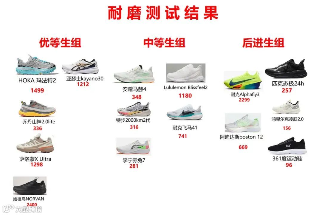 时尚潮流组整体表现优异,专业跑鞋组亦表现出色。萨洛蒙、HOKA、始祖鸟等高价鞋款耐磨性强,长期使用或具较高性价比。