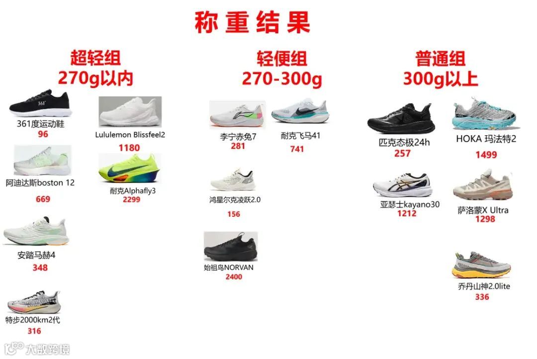 始祖鸟与lululemon鞋重低于300g,表现优异。专业跑鞋除亚瑟士kayano外均达标,后者因针对大体重设计可理解。