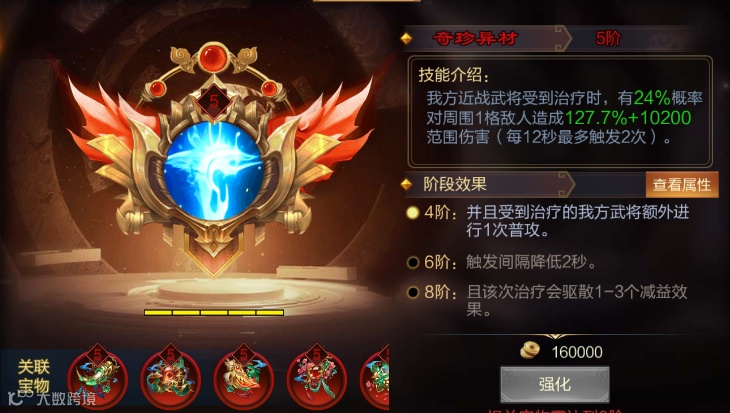 进攻型压制宝物,对我方前排的增益很大。能白嫖普攻,并且还能驱散负面,升阶能宝物在短时间更快的触发。还能压制敌方,偷取敌方的增益以及群体战意压制,干扰敌方的进攻节奏~
