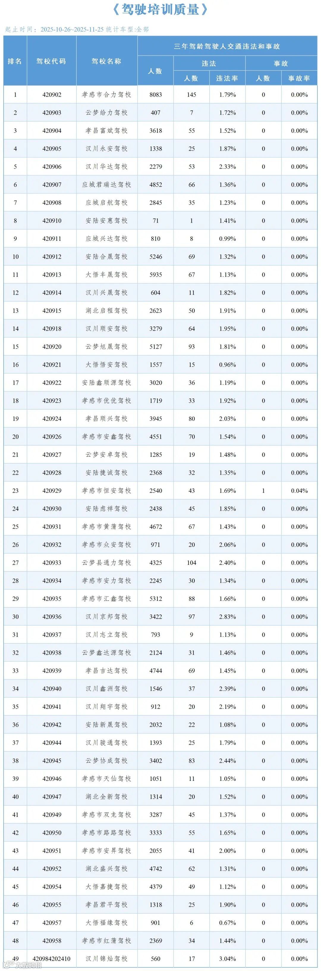 11月份孝感市各驾校综合合格率排名表如下图