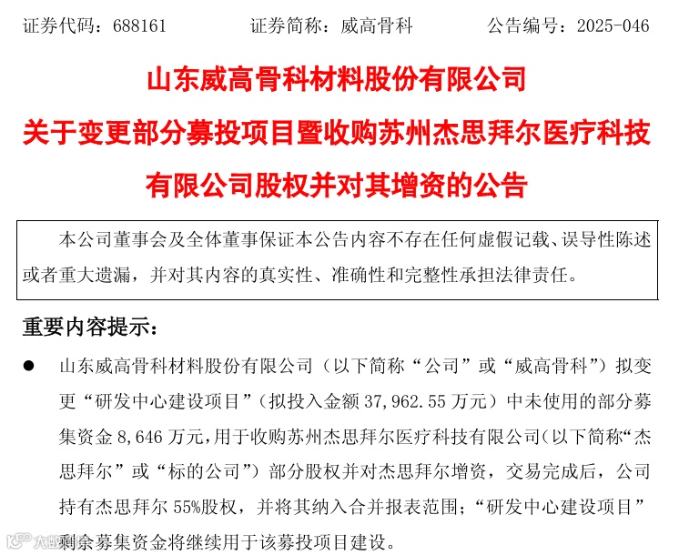 2025年12月11日,威高骨科公告拟动用8646万元募集资金收购苏州杰思拜尔医疗科技有限公司部分股权并增资,交易完成后将持有其55%股权,杰思拜尔将成为其控股子公司。