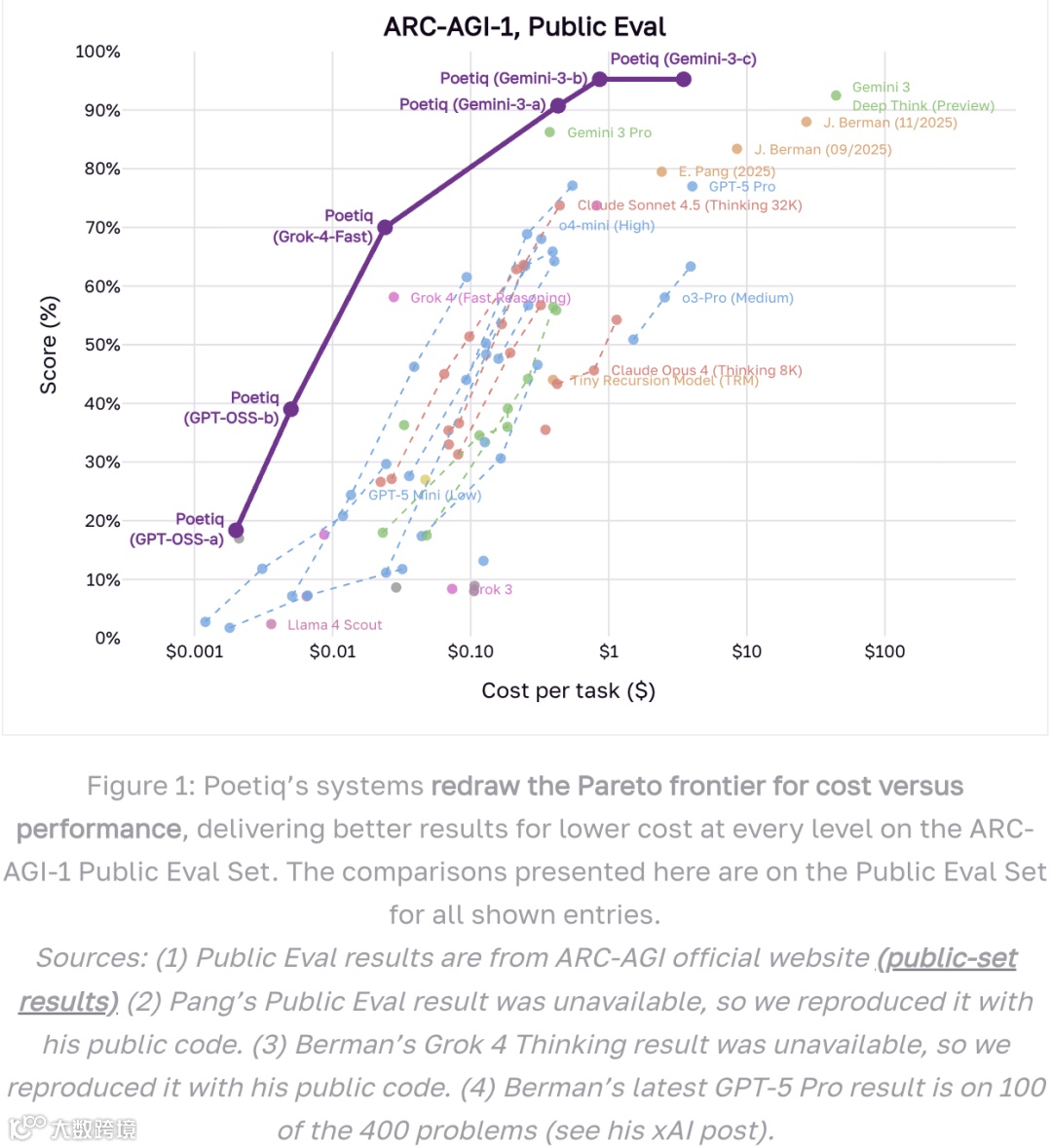 Poetiq已将元系统应用于Google DeepMind、OpenAI、Anthropic及xAI发布的多个主流模型,在ARC-AGI-1测试中全面实现“提准降本”。