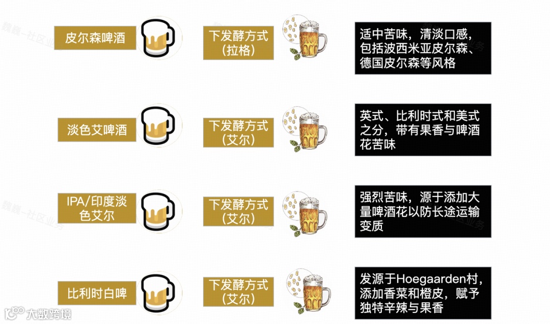 近年来国产无醇啤酒发展迅速,产品类型涵盖拉格、IPA、白啤等主流风格。啤酒基本原料为水、啤酒花、大麦和酵母,按发酵方式分为下发酵(拉格)与上发酵(艾尔)。