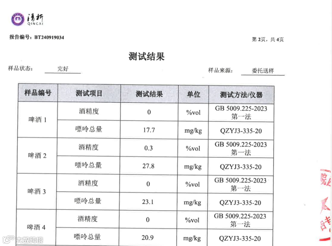 根据国家标准GB4927-2008,酒精度≤0.5%vol的啤酒即可称为无醇啤酒。实测结果显示,20款样品中8款酒精含量低于检测限(标注为0%vol),其余含酒精产品最高仅为0.4%vol,符合国标定义。