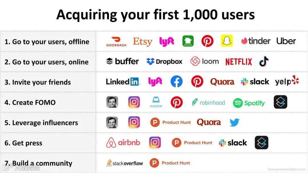 花了一些时间翻译了这篇文章,这是博主 Lenny 在 2019 年撰写的主流消费 APP 是如何获取前 1000 个用户的文章,Lenny 通过搜索网络上的报道,汇总了 10 多款产品创始人的访谈记录,并总结了早期产品推广的七大策略。