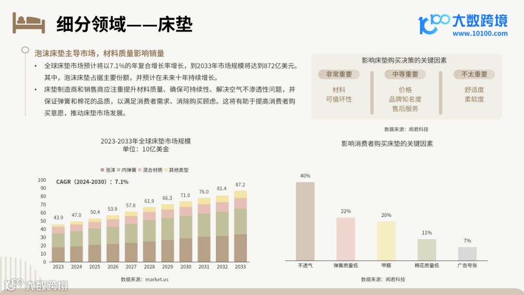 细分品类方面,全球床垫市场预计将以7.1%的年复合增长率增长,到2033年市场规模将达到872亿美元。其中,泡沫床垫占据主要份额,并预计在未来十年持续增长。