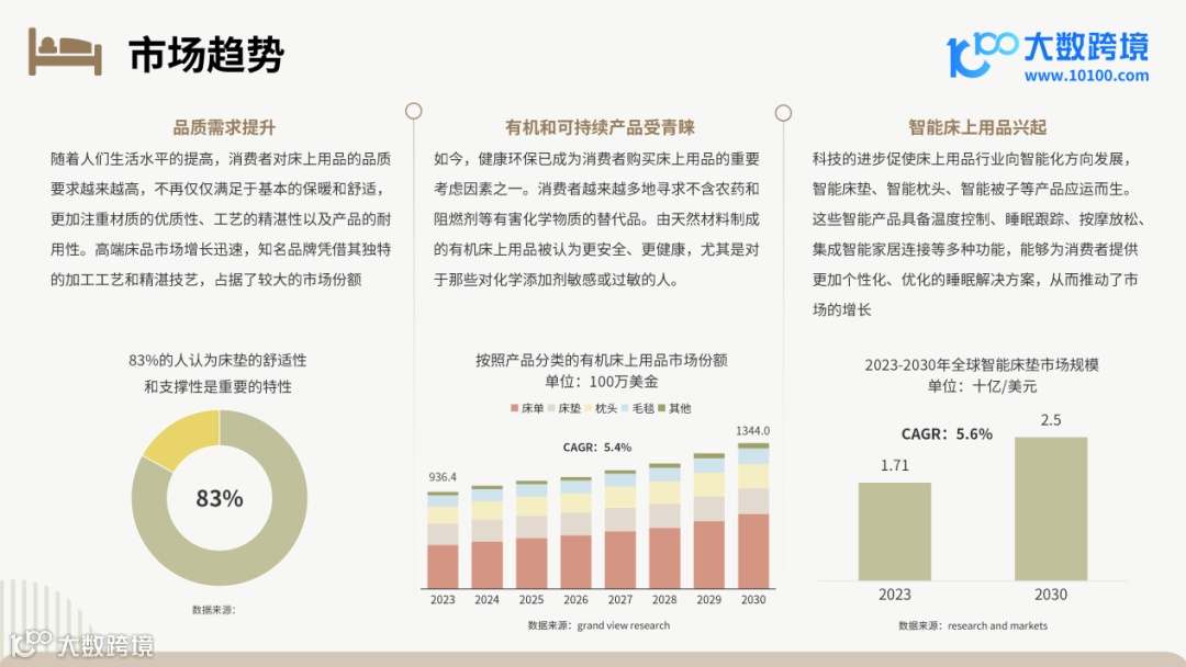 床上用品市场正朝着高品质、有机可持续和智能化方向发展,消费者越来越重视产品的舒适性、健康环保和智能功能。全球智能床垫市场规模和有机床上用品市场份额都将显著增长。