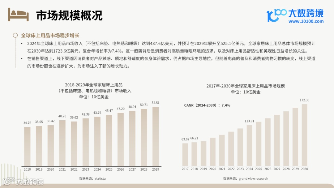 报告还将深入探讨床上用品市场的产业链结构、竞争格局以及海外市场拓展所面临的挑战。关注【大数跨境】公众号,回复【2025全球床上用品市场洞察报告】即可免费下载完整报告查阅。