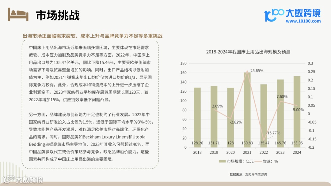 中国床上用品出海市场近年来面临多重困境,主要体现在市场需求疲软、成本压力加剧及品牌竞争力不足等方面。另一方面,品牌建设与创新能力不足也制约了行业发展。