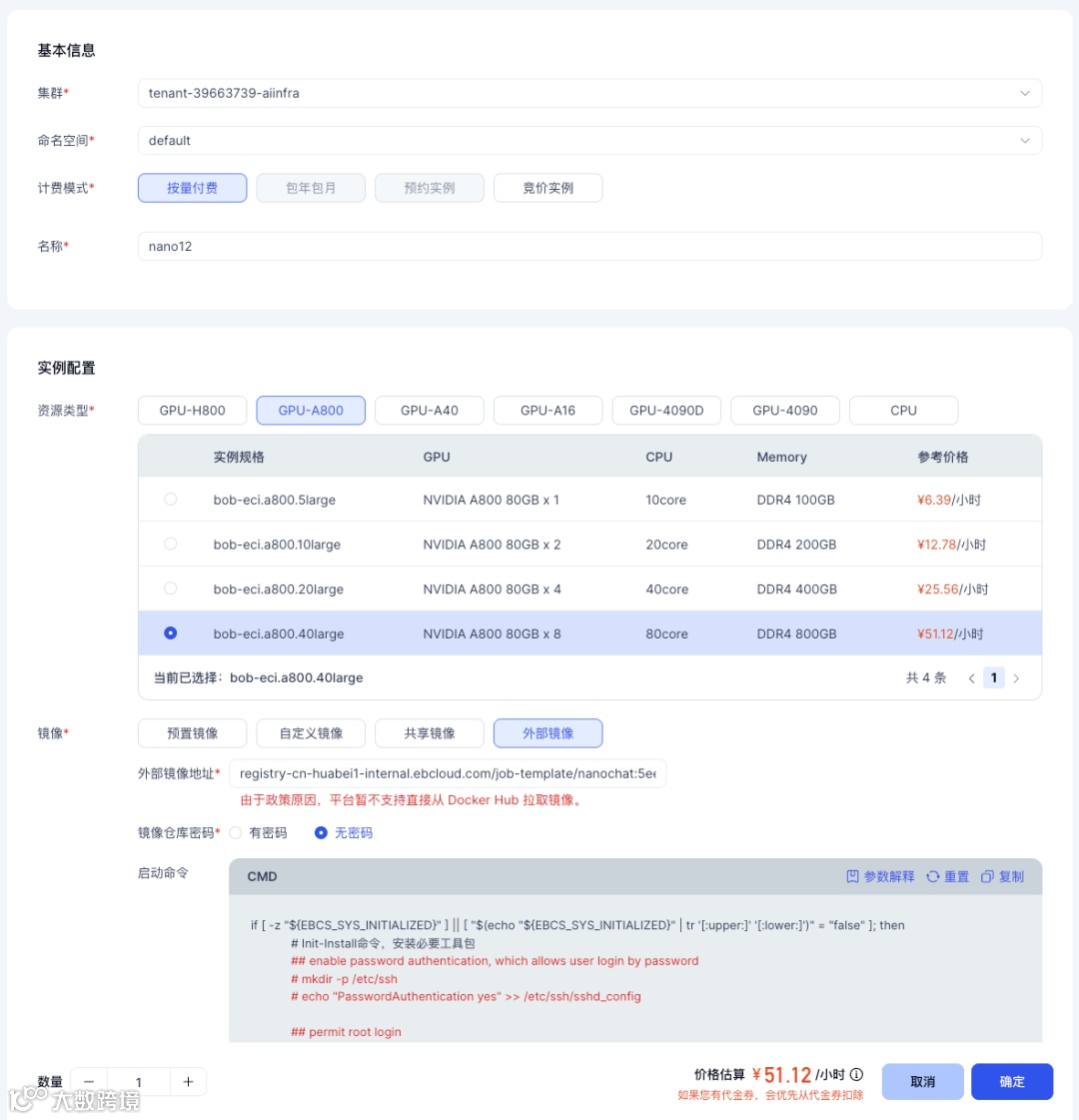 2.选择镜像时,选定“外部镜像”,并填写镜像地址:registry-cn-huabei1-internal.ebcloud.com/job-template/nanochat:c75fe54