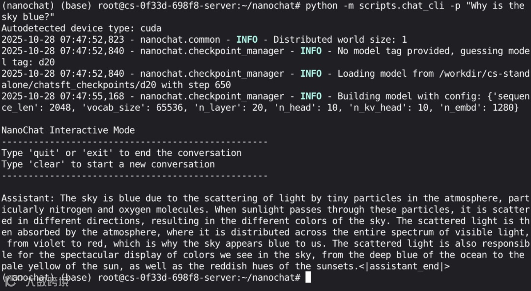 如果模型效果评估通过,我们可以执行以下命令,对我们预训练出的nanochat 模型进行推理实验。