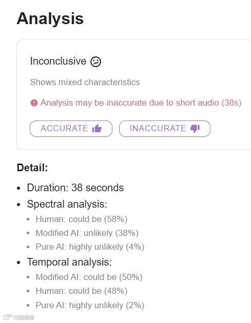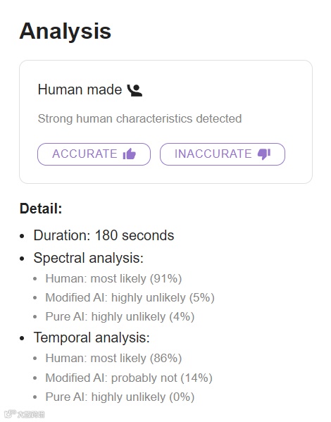 结果同样非常准,5 首里有 4 首被准确地判定为“Human made” (人工制作)。 有一首因为时长比较短,被标记为“不确定”,但网站也很贴心地标注了:“时长太短的歌曲,检测结果可能不准确”。