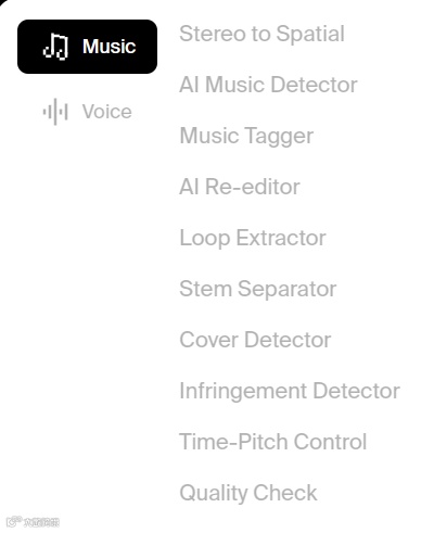 功能: 功能更强了,除了AI音乐检测,还能检测AI语音、音乐拆分轨、立体声转环绕声、音乐打标等。