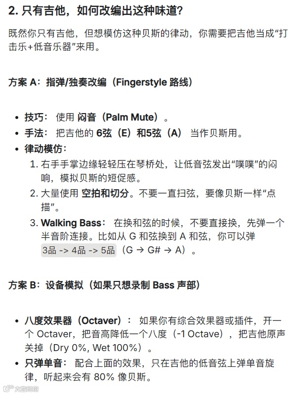 把你喜欢的歌丢进去,问它:“这首歌的 Bassline 有什么特点?我想写一首类似的,但我只有吉他,怎么改编?”