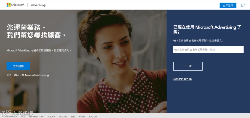 要开始使用 Bing Ads ,首先要访问Microsoft网站并选择注册或登录。