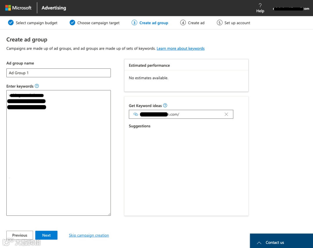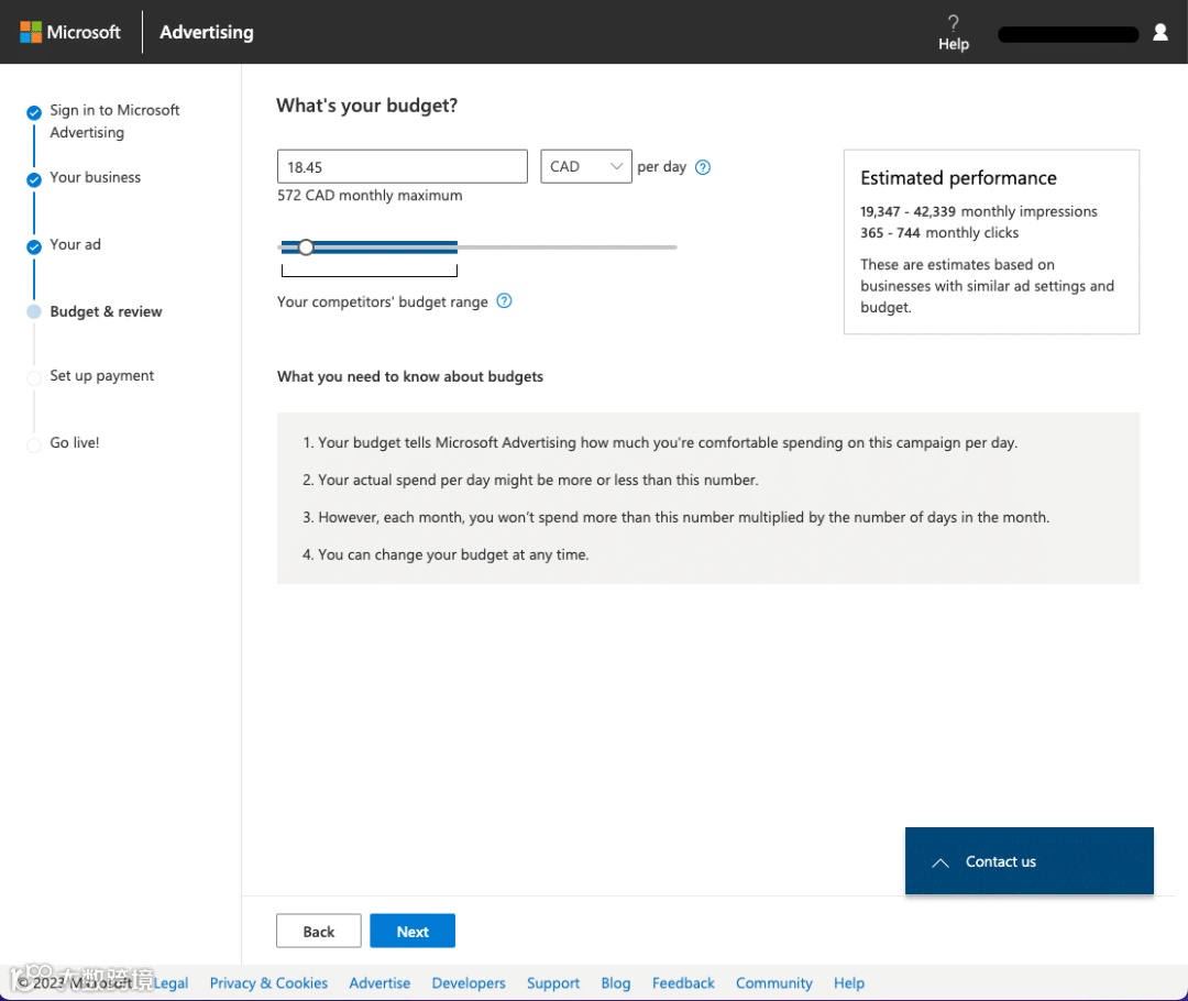 Microsoft 在屏幕右侧为您提供了一个方便的估计性能框。此功能使您可以轻松了解广告可能产生的每月潜在展示次数和点击次数。它是了解活动范围和影响力的宝贵工具。