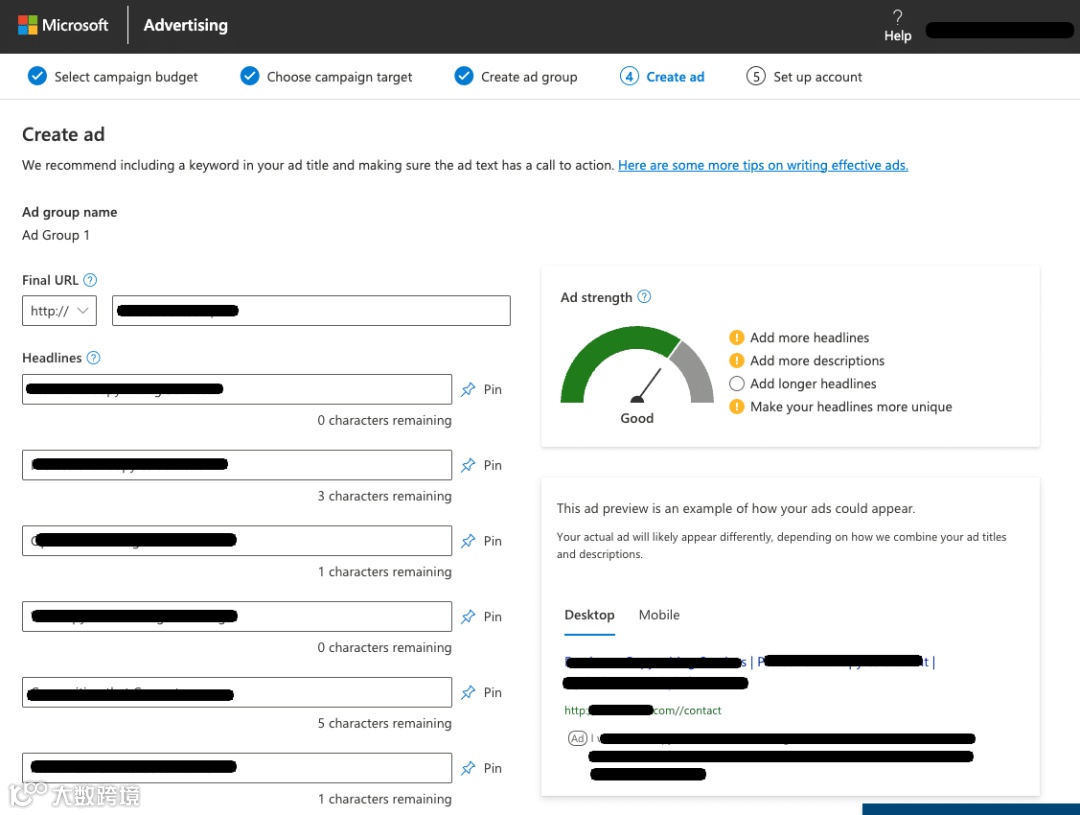 向您的广告添加文字。创建它时,您可以轻松预览它在屏幕右侧的显示效果。不仅如此,如果您超出了建议的字符数限制,Microsoft还会通知您。此功能可确保您的广告不会被切断或截断,从而保持其有效性和视觉吸引力。