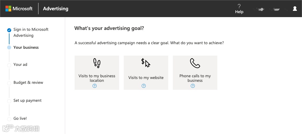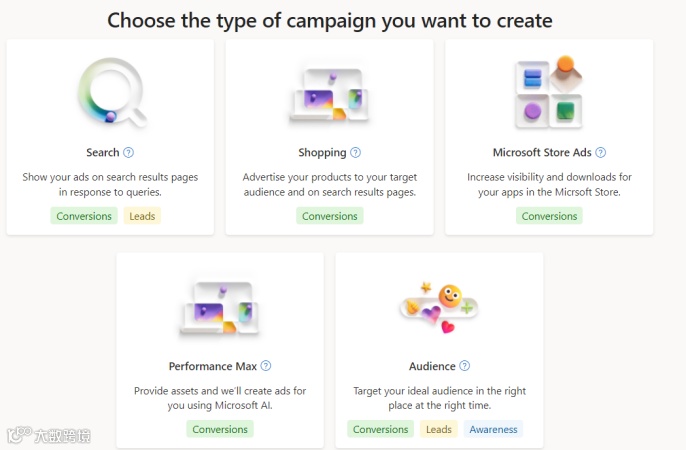 接下来,设置 Bing Ads 广告系列的目的。定义您的目标至关重要,目标范围包括提高网站转化率、利用动态搜索广告或促进产品目录的销售。Microsoft将指导您完成您可以使用的各种选项,从而使整个过程变得精简且用户友好。