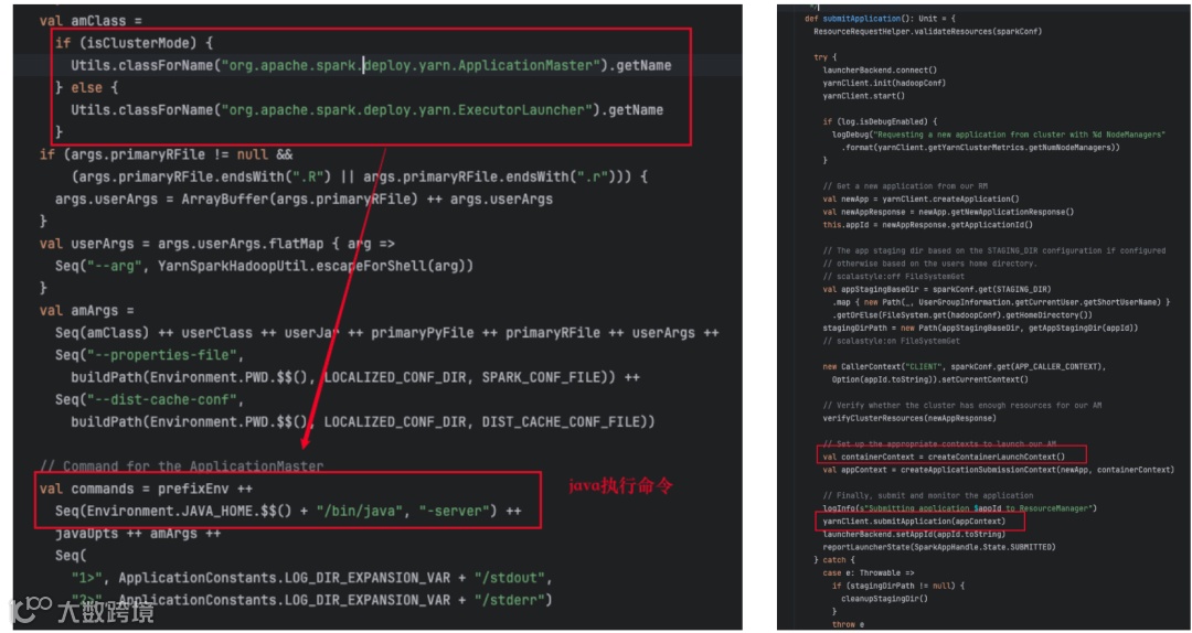 SparkSubmit类 -> main方法 -> doSubmit方法 -> submit方法 -> runMain方法 -> SparkApplication类 -> start方法-> YarnClusterApplication类 -> run方法 -> submitApplication方法 -> createContainerLaunchContext方法 -> ApplicationMaster -> main方法 -> run方法 -> runDriver方法 -> startUserApplication方法 -> createAllocator方法 -> ExecutorRunnable类 -> launchContextDebugInfo方法 -> prepareCommand方法 -> YarnCoarseGrainedExecutorBackend类 -> main方法 -> run方法 -> CoarseGrainedExecutorBackend类 -> Executor类 -> threadPool
