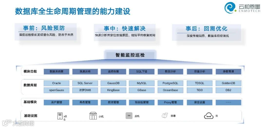 针对这一现状,江宁提出:“破解多元异构运维难题,核心在于构建标准化、自动化、智能化的数据库全生命周期管理体系。”为此,江宁详细阐述了云和恩墨以zCloud多元数据库智能管理平台为核心的解决方案。该平台不仅支持Oracle、MySQL、PostgreSQL、OceanBase、TiDB、GaussDB、达梦等30余种主流数据库,兼容物理机、虚拟机、私有云、公有云等多样化基础设施,实现“一站式纳管”;还高度体现了云和恩墨的数据库智能运维之道,即“始于采集,准于定位,善于分析,严于安全,终于稳定”,从“事前-事中-事后”三阶段构建数据库全生命周期的管理中枢。