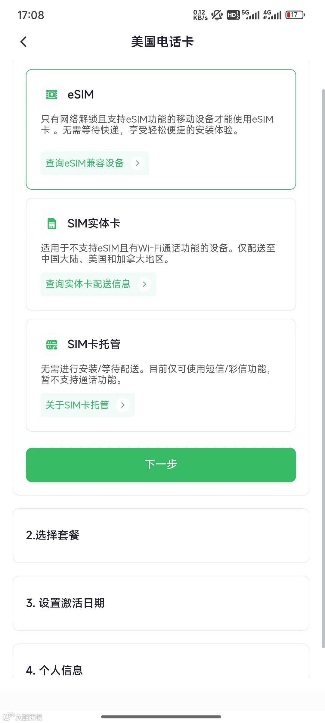 3. 返回主界面,选择“美国电话卡”,根据需求选择eSIM或实体卡形式。