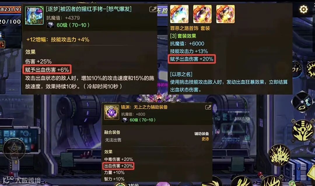 其中镇渊特殊贴膜装备能大幅度提升异常伤害,配合罪恶首饰套,爆发伤害碾压增幅12恍惚套,罪恶首饰套以出血伤害为核心,加上特殊装备的贴膜,20%的增伤可以提升4%以上的强度。