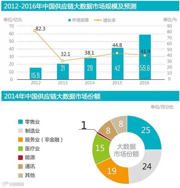 易观智库日前发布的《2014中国供应链大数据市场专题研究报告》显示,在2014年中国供应链大数据份额中,零售业、制造业、服务业(非金融)、医疗业占比最多,约占83%市场份额,而能源仅占1%。而据易观智库预测,2016年中国供应链大数据市场将达到60亿左右(不含供应链金融部分)。