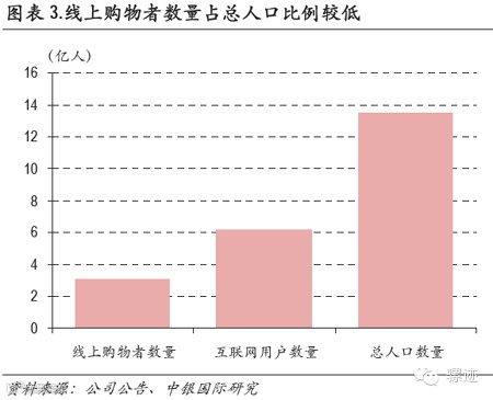 目前线上购物者数量占比互联网用户约49%,占比总人口仅约22%。从中美数据对比来看,中国互联网和移动互联网渗透率分别为46%和37%,远低于美国的82%和68%。随着国内互联网和移动互联网技术的推广,以及经济结构转型的推进,未来线上消费规模的提升空间巨大。