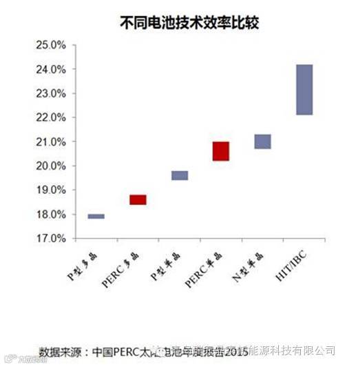 可以说,领跑者计划直接促进了高效技术与产品的应用。在“领跑者”计划的推动下,国内光伏终端市场逐步从粗放式发展向集约式、高品质方向转变;电池方面,2016年预计产业化生产的多晶硅电池转换效率将达到18.5%,单晶硅电池更是有望达到21%。[ii]而且,由于单晶组件采用半导体级品质的硅片,未来转换效率提升和成本下降空间更大,这意味着单晶将成为未来几年降低度电成本的最佳技术,成为未来市场发展的趋势。如今光伏市场中主流单晶电池转换效率已经比常规电池高1.5百分点以上,主流组件功率比常规组件高15W;PERC技术的运用,将进一步加速单晶产业化的推进。从2015中国PERC太阳电池年度报告中可以看出,PERC技术在单晶电池方面体现了更好的溢价优势和发展空间,可使单晶电池的转换效率提升1个百分点,而多晶电池仅为0.5个百分点。基于这种效率优势,业内单晶新秀乐叶光伏在江苏泰州2GW电池项目预计全部为PERC电池,而天合、晶澳、SolarWorld以及技术早已稳定的台湾厂商均有单晶PERC电池扩产规划。未来3-5年内,PERC工艺与MWT工艺、N型硅片工艺结合将引起更高效率产品的产业化,单晶转换效率优势会扩大到3个百分点以上,单晶组件功率优势会扩大到50W以上。
