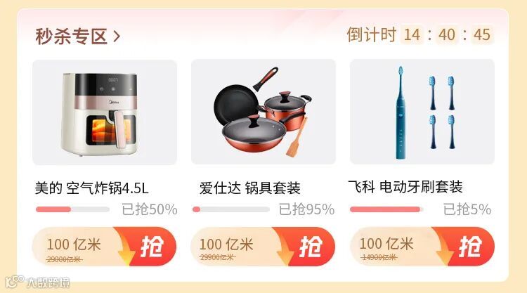 全新上线的秒杀专区将不定期推出超值爆款商品,超低“亿米”就能抢购!拼手速的时候到了,记得每天来逛逛,下一个幸运 “捡漏王” 就是你!