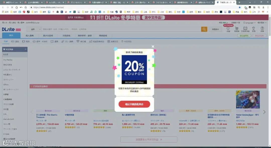 每个月DLSITE都会免费送商品,例如游戏、CG插画、漫画和音声等,我将其称为DLSITE喜加一_(:з」∠)_