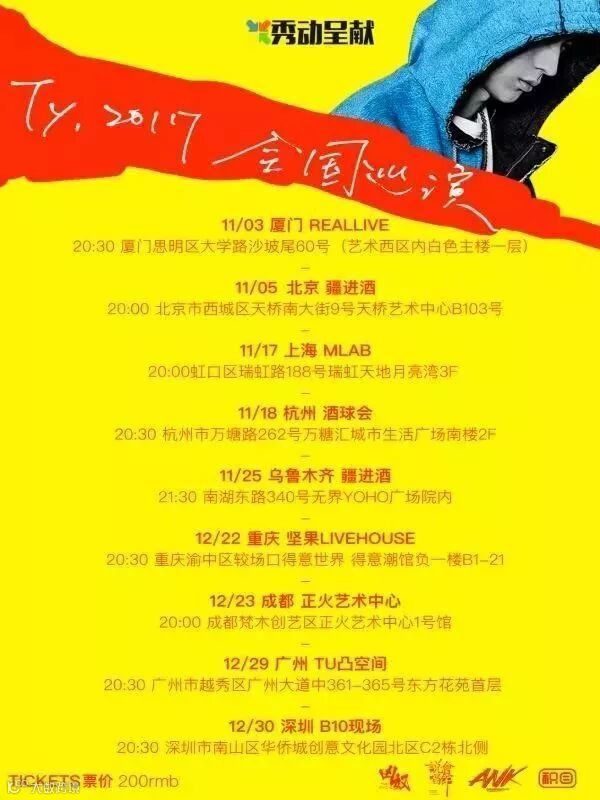 所以,在嘻哈一片狂热之下,这样一个现场不要错过啊!Ty. 2017全国巡回演唱会即将开启,你准备好了吗!凹好造型去炸裂吧!