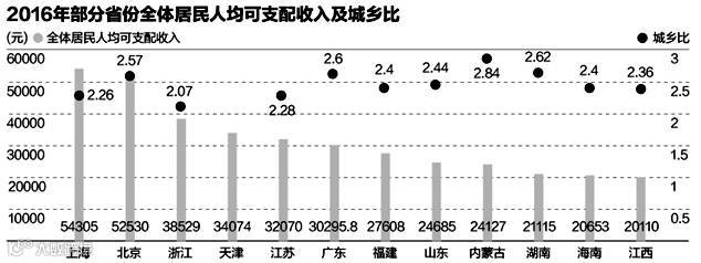 通过对2016年各省份的全体居民、城镇居民和农村居民的人均可支配收入等多个指标的统计发现,目前有6个省份的居民人均可支配收入突破了3万元大关;在城乡平衡发展方面,浙江的城乡差距最小,西部地区最大。