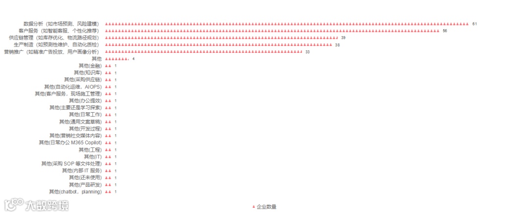 从这些数据可以推测出,在企业中数据分析和客户服务是 AI 技术应用最为广泛的场景,分别有61家和56家企业表示在这些场景使用了AI技术。这可能是因为数据分析能够帮助企业更好地了解市场和自身运营情况,做出更明智的决策;而客户服务方面的应用可以提升客户体验,增强客户满意度和忠诚度。