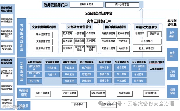 灾备服务管理平台,面向灾备服务化提供规范的灾备服务目录,集中管控灾备系统资源和策略,实现灾备资源的共享以及灾备资源的统一高效运维。