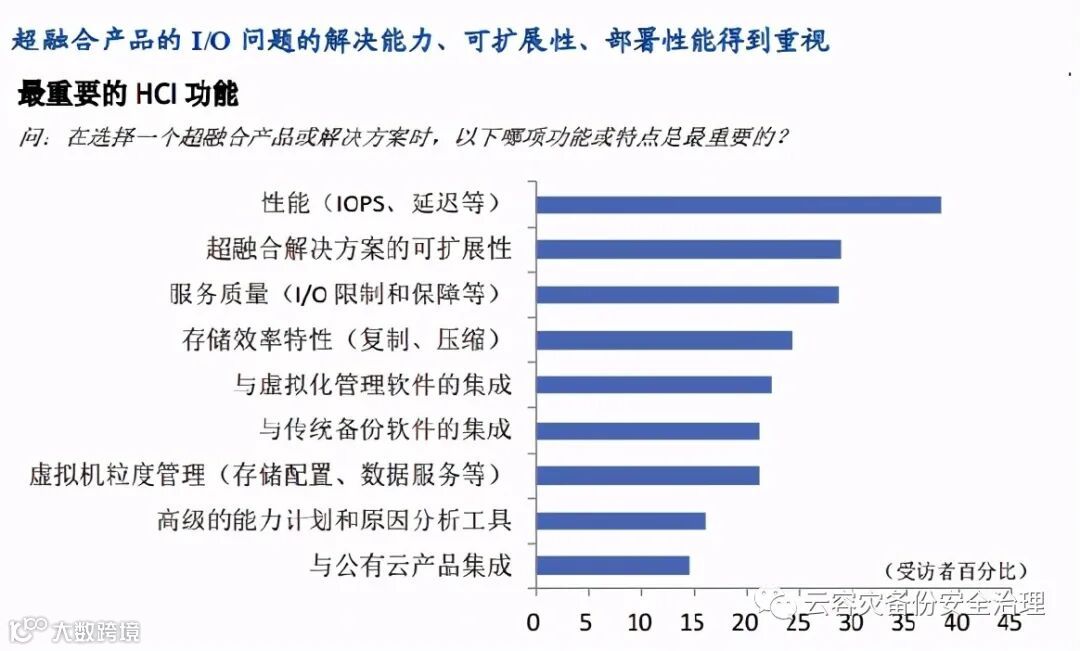 备份、容灾业务连续性强:在复制、容灾中,传统架构更多是基于Array-Level、通过存储卷的复制来实现,超融合方案的容灾,大多是基于VM-Level 来进行,尤其是与Hypervisor 配合起来更为便利,但还不能满足RTO/RPO=0 的双活要求。超融合在通常的数据复制、异地容灾(不严格要求双活)的环境中,可用性较强,而随着超融合技术的发展,客户接受程度的提升,超融合在容灾方面替代传统架构也将实现。
