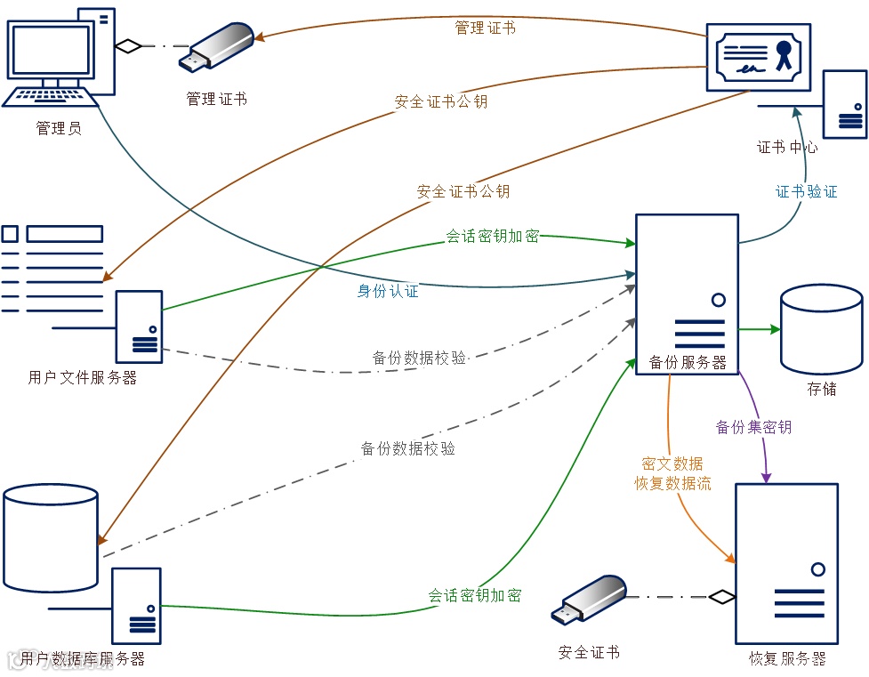 基于对备份设备访问时的安全性要求,需要关联绑定证书进行用户认证。在数据备份至备份设备时,通过对备份数据的加密传输从而确保备份数据在网络中的安全。
