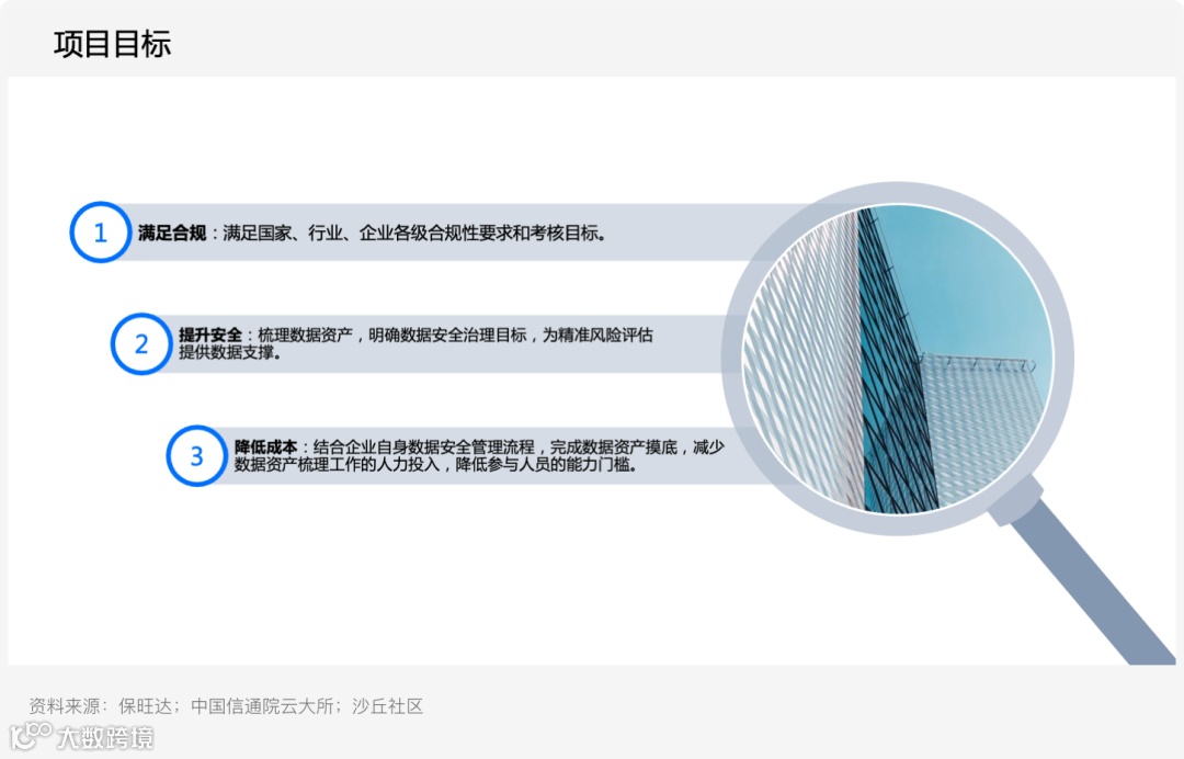 • 三大目标:包括数据安全防护、数据监管合规和数据安全流通;