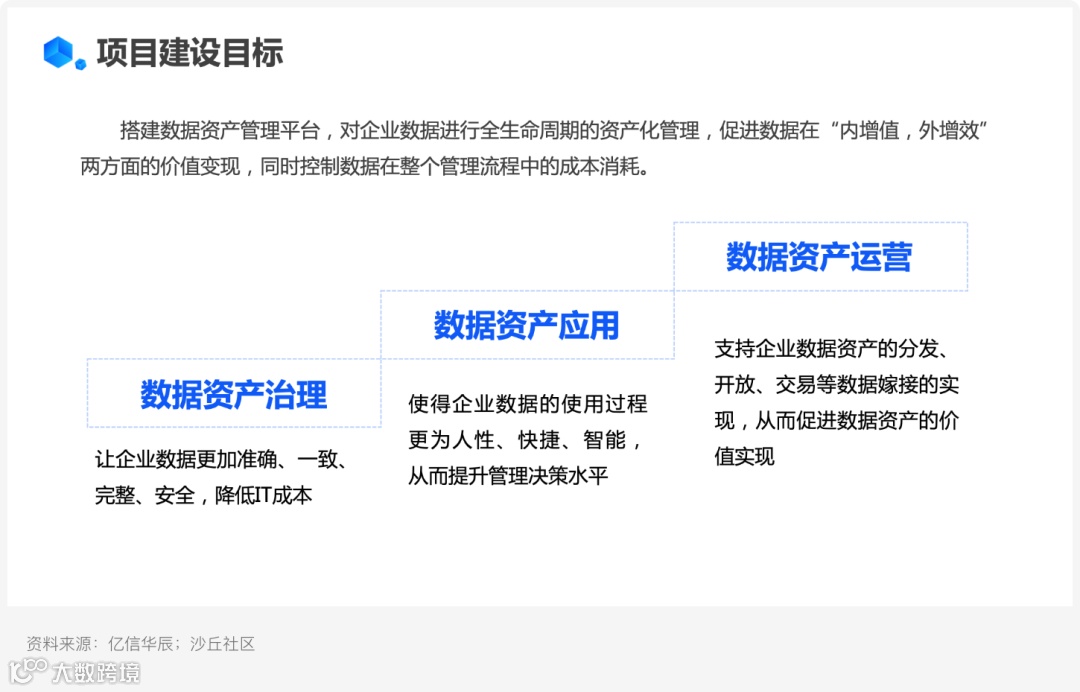 因此,时代中国与亿信华辰合作建设数据资产管理平台,从数据资产的治理、应用到运营,对企业数据进行全生命周期的资产化管理,促进数据在“内增值、外增效”两方面的价值变现,同时控制数据在整个管理流程中的成本消耗。