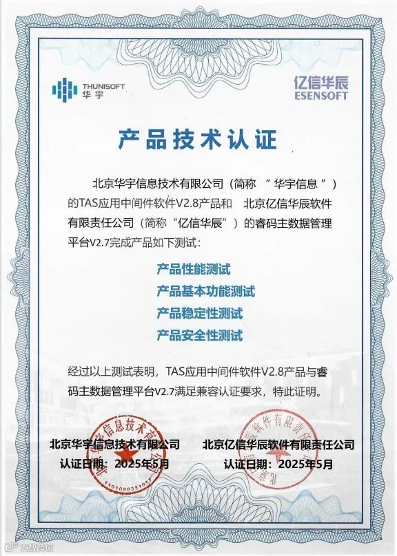 近日,亿信华辰ABI、睿治、睿码、i@Report多款产品最新版本与华宇TAS应用中间件V2.8成功通过兼容互认证测试,双方产品在功能协同、性能优化及高可用性等维度实现全面适配,将为用户提供更加稳定、高效、安全的国产化解决方案。