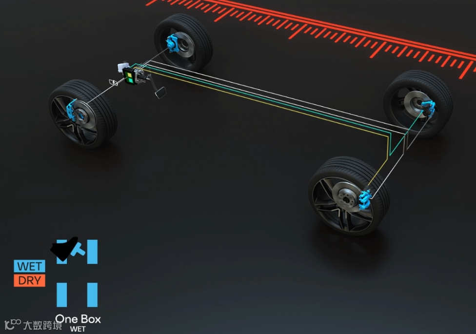 One Box制动系统:线控制动搭配液压后备系统,典型应用就是搭载在零跑D19系列车型的MK C2制动系统。