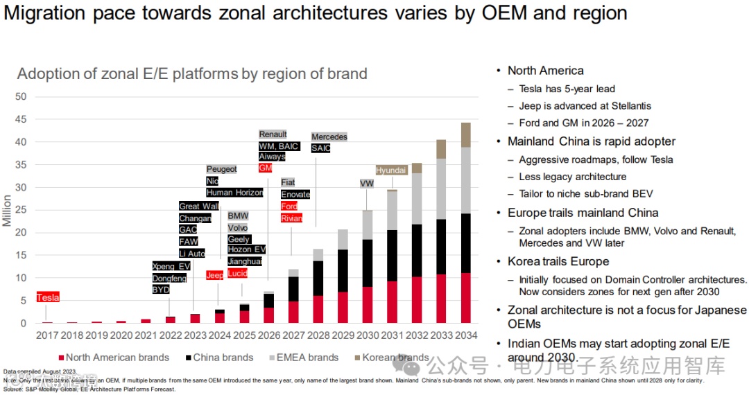 在升级到区域控制电子电气架构时,对于不同OEM和世界不同地区,其进化阶段会由于实际现状而呈现不同进展。北美公司中特斯拉已经实现了区域控制的全面领先,福特和通用规划在2026年落地;中国的主机厂制定了较为激进的区域控制开发计划,试图仅仅跟住特斯拉的技术迭代,同时由于有一些新势力公司,从头开发新的车型,因此可以直接采用区域控制+中央计算的电子电气架构,所以进展比较迅速;欧洲主机厂在新型电子电气架构层面始终跟进中国公司;韩国主机厂一开始主要聚焦在功能域控制器,会在下一代车型预计2030年导入区域控制器。