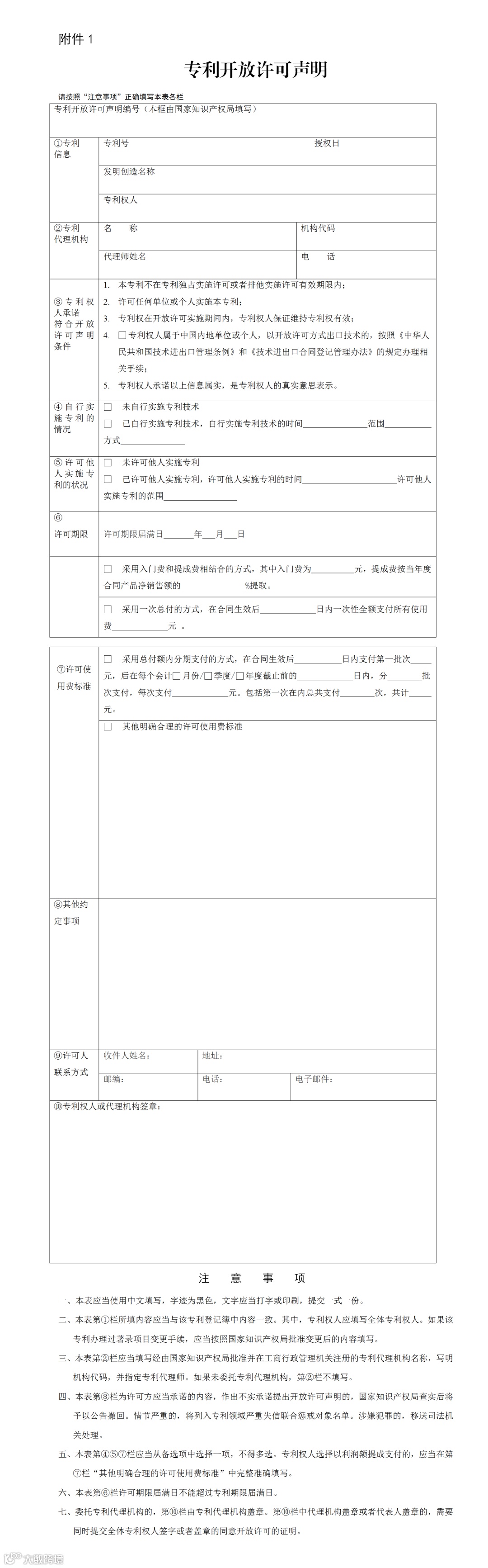 (1)《专利开放许可声明》。该声明为国家知识产权局标准表格(详见附件1),填写内容应当打印(签章除外),不得涂改。专利业务办理系统中网上填报内容应当与《专利开放许可声明》保持一致。
